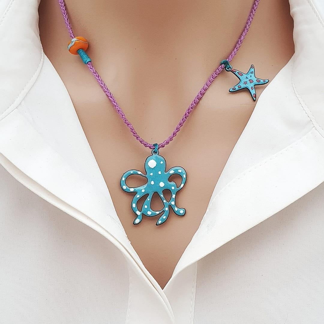 Denizlerin derinliklerinde yaşayan büyüleyici ahtapot ve zarif deniz yıldızının birleşimiyle oluşturulan bu özel kolye, okyanusun gizemini ve güzelliğini boynunuza taşır. Her detayında el işçiliğinin ve sanatın izlerini barındıran bu tasarım, canlı turkuaz rengiyle ruhunuza denizin ferahlığını taşır.