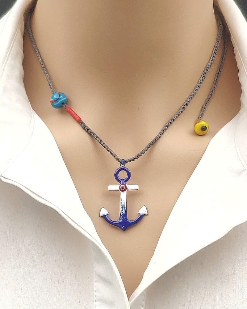 Denizin özgürlüğünü simgeleyen çapa figürü, koyu mavinin derinliği ve beyazın saf ışıltısıyla buluştu. El yapımı bu özel tasarım, güven, istikrar ve denizle kurulan içsel bağın anlamını boynunuzda taşır.