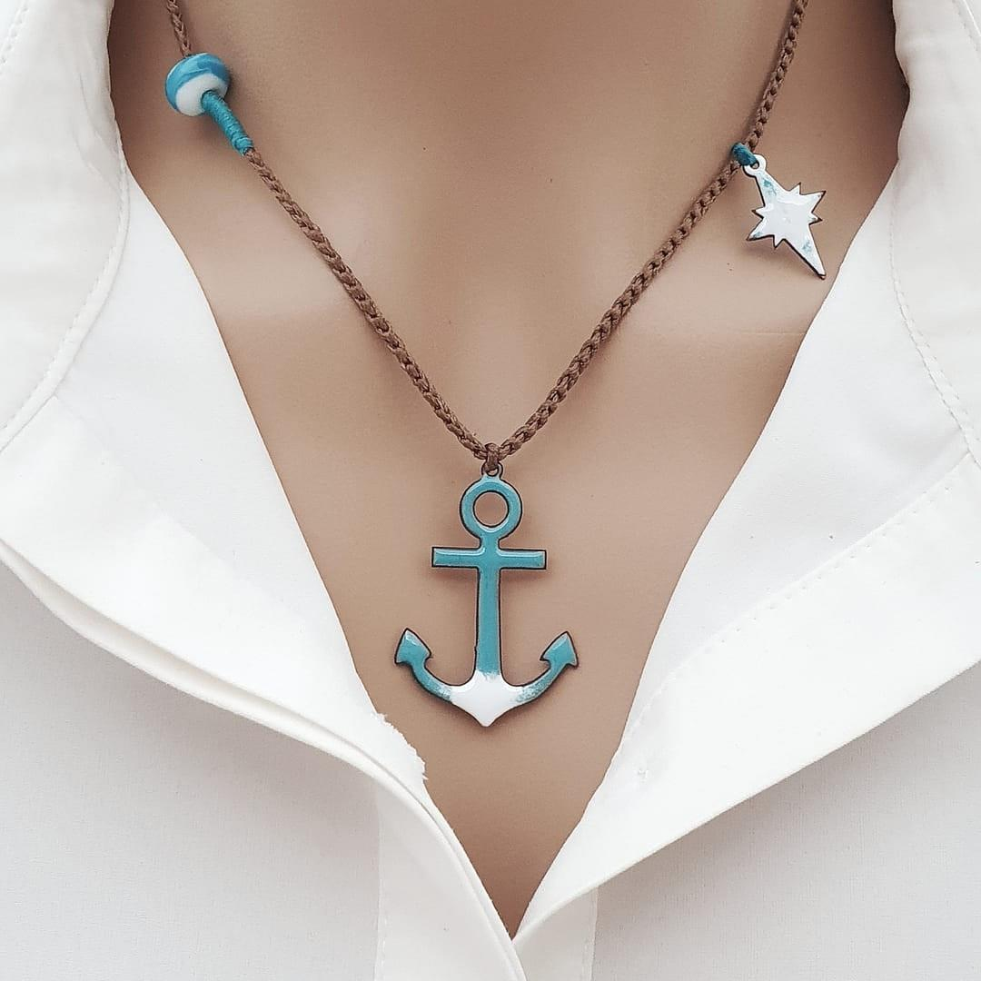 Denizin huzurunu simgeleyen çapa, turkuazın canlandırıcı enerjisi ve kuzey yıldızının yol gösterici anlamıyla birleşti. El yapımı bu kolye, hem denizle kurulan bağı hem de içsel rehberliği sembolik bir zarafetle taşır.
