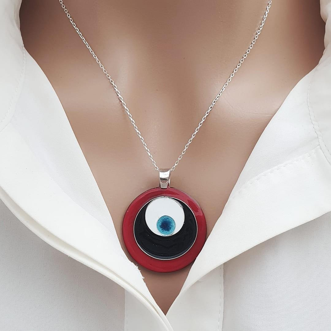 Kırmızı rengin enerjisiyle güçlenen Nazar Kolye, hem koruyucu bir sembol hem de tutkunun simgesidir. Nazar figürü, kötülüklerden korunmayı temsil ederken; kırmızının güçlü tonu, cesaret ve canlılık katar.