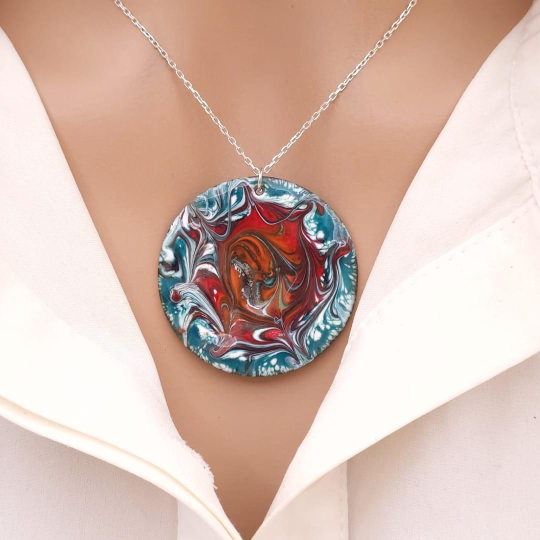 Her yüzüyle farklı bir hikâye taşıyan bu özel ebruli kolye, bir tarafında lacivert-kırmızı-beyaz sarmalların enerjisini, diğer tarafında kırmızı ve koyu yeşilin derin kıvrımlarını barındırır. Renklerin ritmiyle şekillenen tasarım, stilinize özgün bir karakter katar.