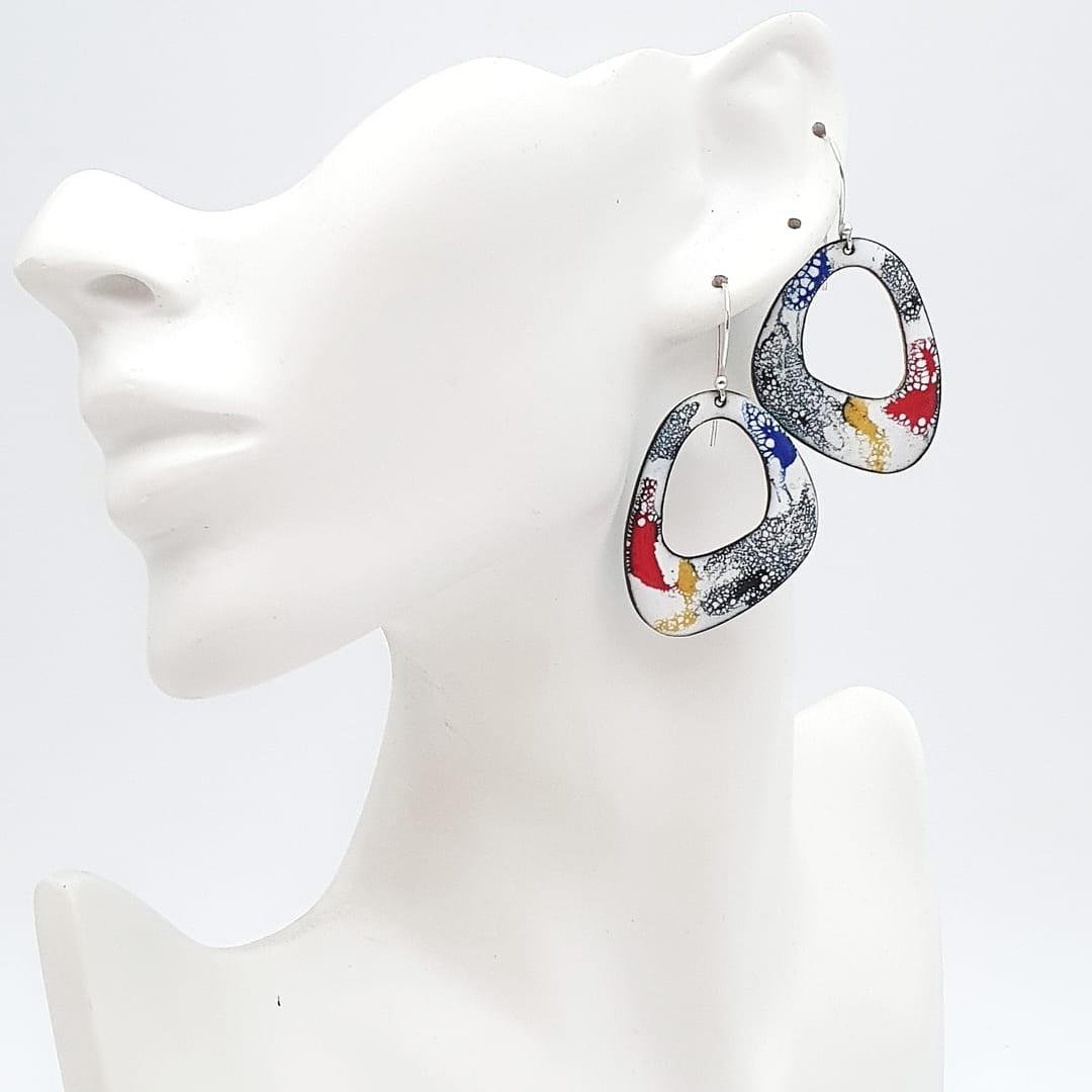 Geometrik formların dinamizmini beyaz, mavi ve kırmızının kontrastıyla buluşturan bu küpe; enerjik, modern ve özgün bir ifade taşır. Renklerin uyumu, hareketi ve canlılığı temsil ederken, geometrik hatlar tasarıma güçlü bir karakter kazandırır.