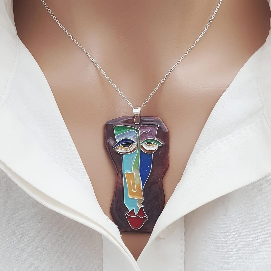 1000 ayar gümüş tellerle desen verilerek şekillendirilen kolye ucu, mine cam tozlarıyla 780°C’de fırınlanarak bakır üzerine kaplandı. 3,2 x 5,5 cm ölçülerindeki tasarım, 45+5 cm uzunluğundaki 925 ayar gümüş zincirle tamamlandı. El yapımı olması sayesinde ufak farklılıklar benzersizliğini artırır.