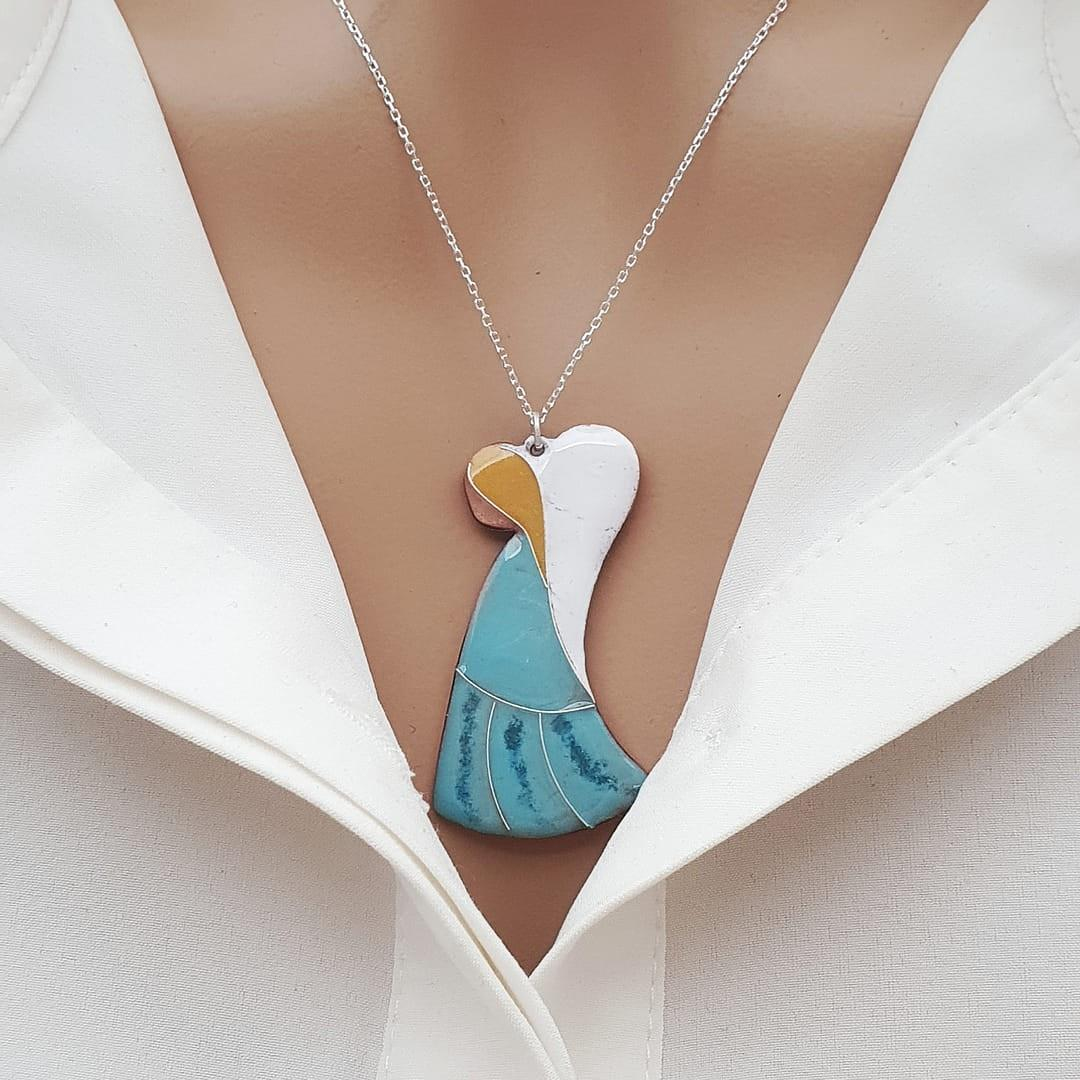 1000 ayar gümüş tellerle desen verilen kolye ucu, mine cam tozlarıyla 780°C’de fırınlanarak bakır üzerine işlendi. 2,7 x 4,8 cm ölçülerindeki tasarım, 45+5 cm uzunluğundaki 925 ayar gümüş zincirle tamamlandı. El yapımı olması sayesinde ufak farklılıklar benzersizliğini artırır.