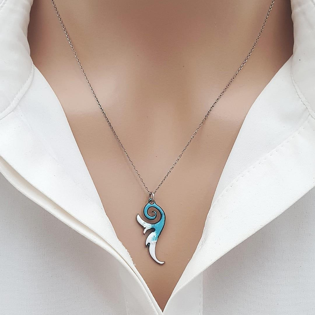 780°C’de mine fırınında cam tozlarıyla çift taraflı işlenen kolye, 1,4 x 2,8 cm ölçülerindedir. 925 ayar gümüş zinciri (45 cm + 5 cm) ile tamamlandı. El yapımı olduğu için ufak farklılıklar benzersizliğini korur.
