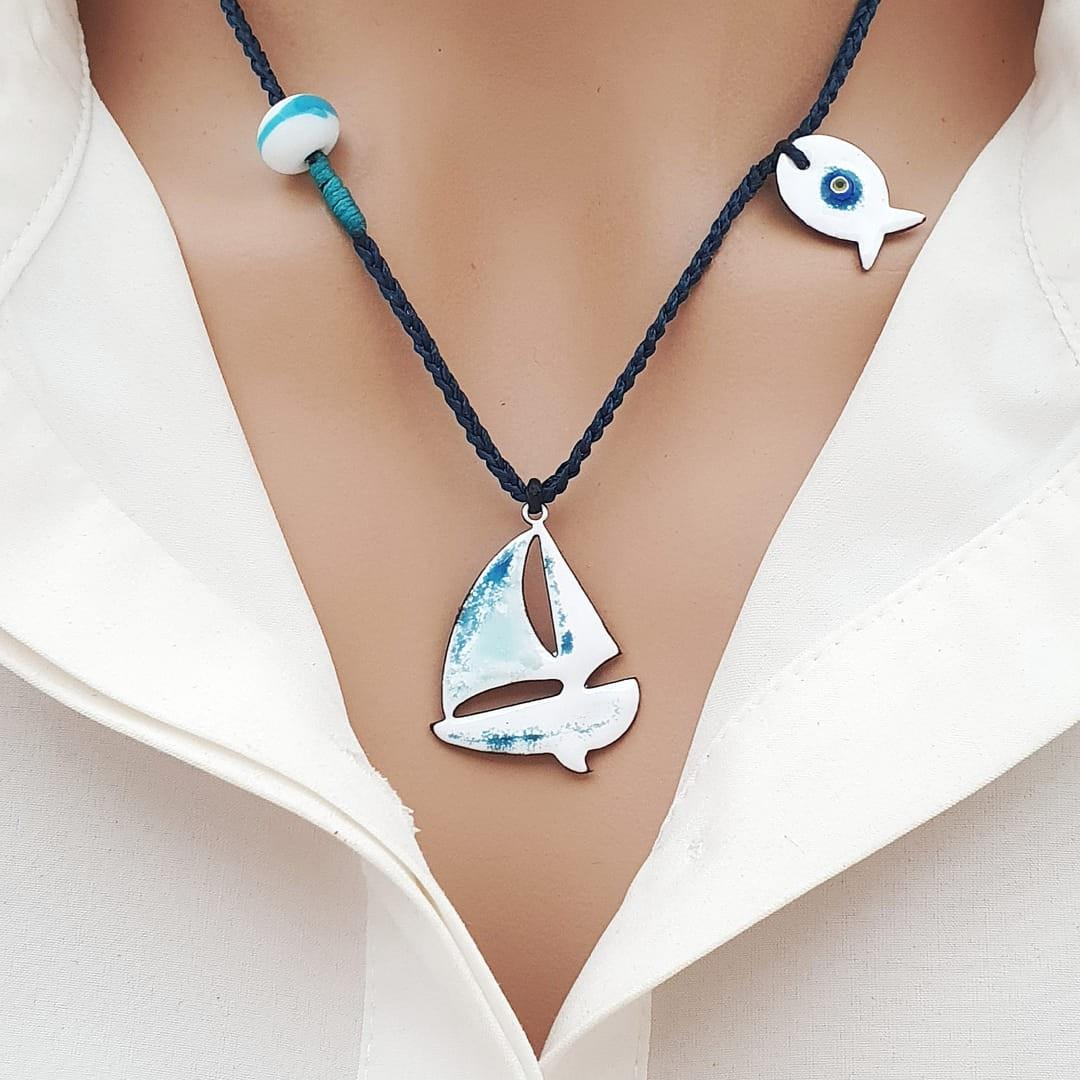Deniz yolculuğunun özgürlüğünü ve balığın bereketini simgeleyen bu özel kolye, el yapımı detaylarla hayat buluyor. Hem deniz tutkunlarına hem de özgün tasarım arayanlara hitap eder.