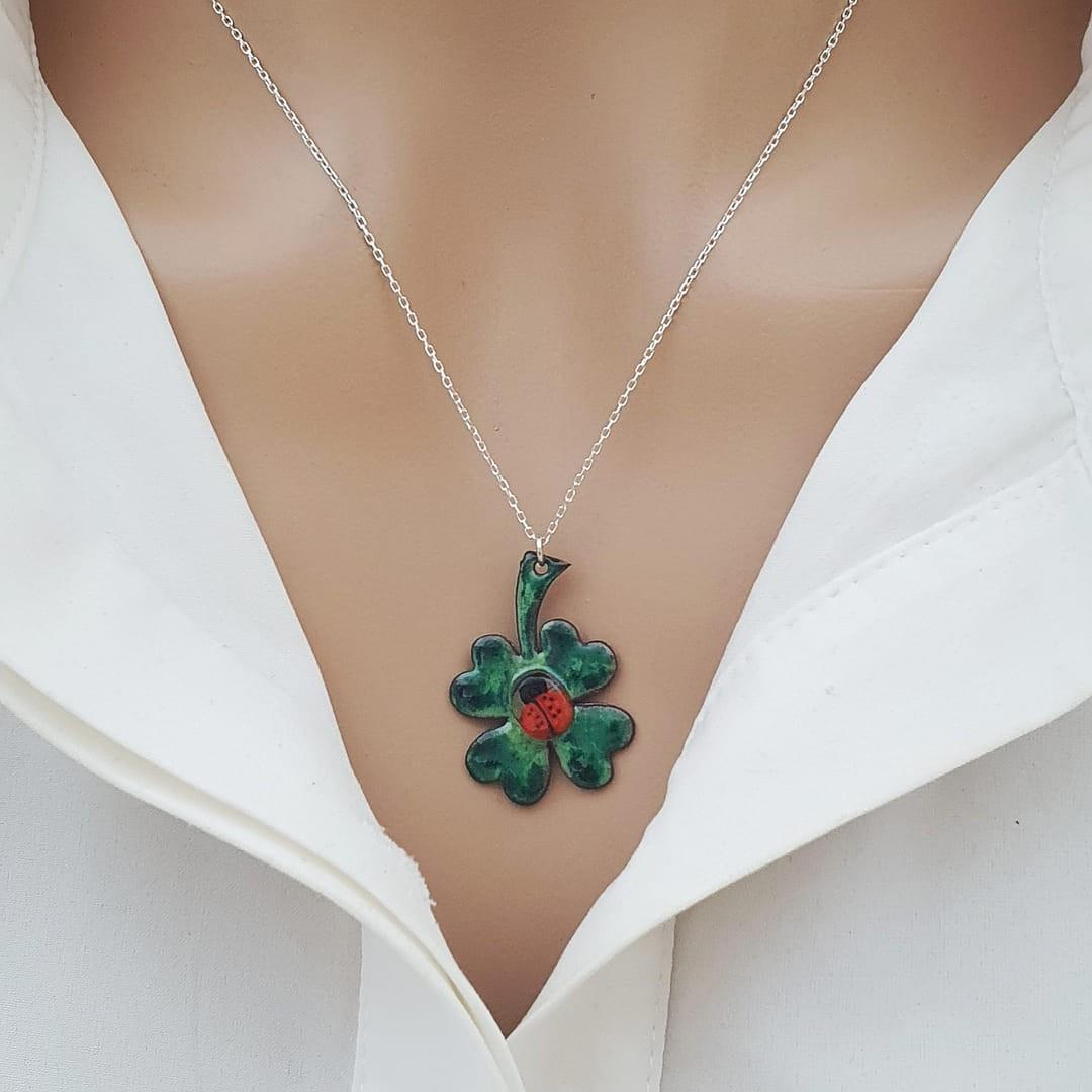 Uğur böceğinin neşesiyle dört yapraklı yoncanın iyimserliğini bir araya getiren bu el yapımı kolye, şansa ve yaşama sevincine zarif bir dokunuş katıyor. Hafif ve zarif yapısıyla günlük kullanımda da özel anlarda da görünmez ama hissedilir bir şıklık sunuyor.